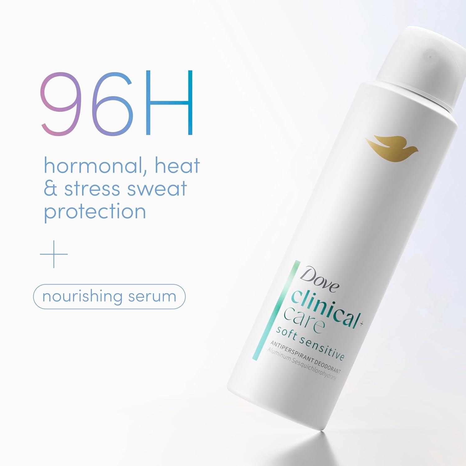 Meet Dove Clinical + Care Antiperspirant Deodorant, our best protection for hormonal, heat, and stress sweat. Designed for all of life's sweat triggers, this clinical strength antiperspirant deodorant dry spray delivers extra effective sweat protection for an impressive 96 hours. With its odor-fighting technology, you can feel fresh and confident throughout your day, no matter what challenges come your way. Ideal for long workdays, intense workouts, or travel, Dove Clinical + Care ensures you stay fresh and dry when it matters most. Enriched with 7% nourishing serum, Dove Clinical + Care has an advanced formula that not only helps repair the skin's natural barrier but also leaves your underarms feeling soft, smooth, and irritation-free – even after shaving. Dove is the dermatologist recommended antiperspirant deodorant brand and combines powerful protection with gentle care, making it an ideal deodorant for sensitive skin. This clinical antiperspirant deodorant is hypoallergenic and features a long-lasting, light and fresh fragrance, elevating your daily routine. Dove Clinical + Care is easy to apply: simply shake well, spray on your underarms from 6 inches away, and enjoy instant dryness with lasting comfort. As part of Dove's commitment to care, this Dove Clinical + Care is PETA Approved Vegan. Globally, Dove does not test on animals.