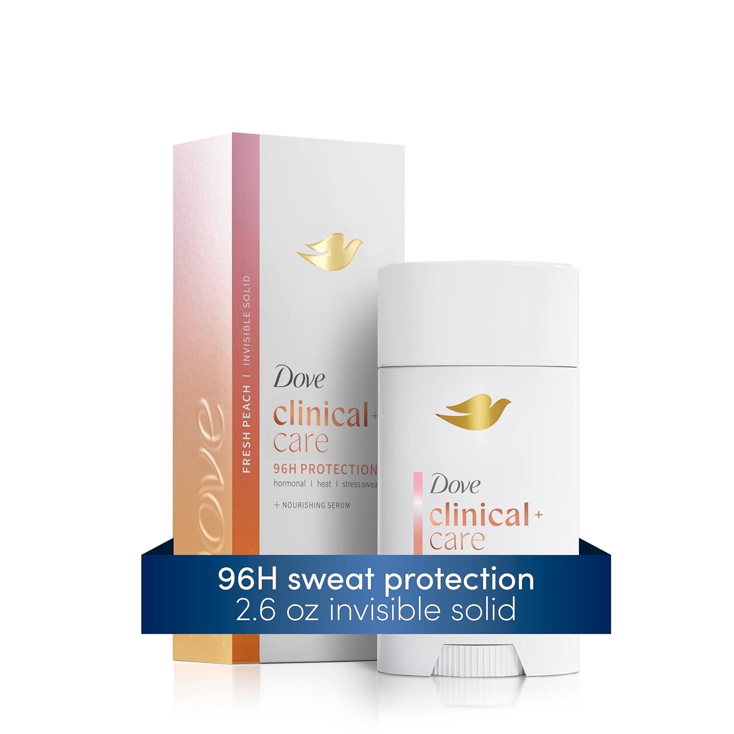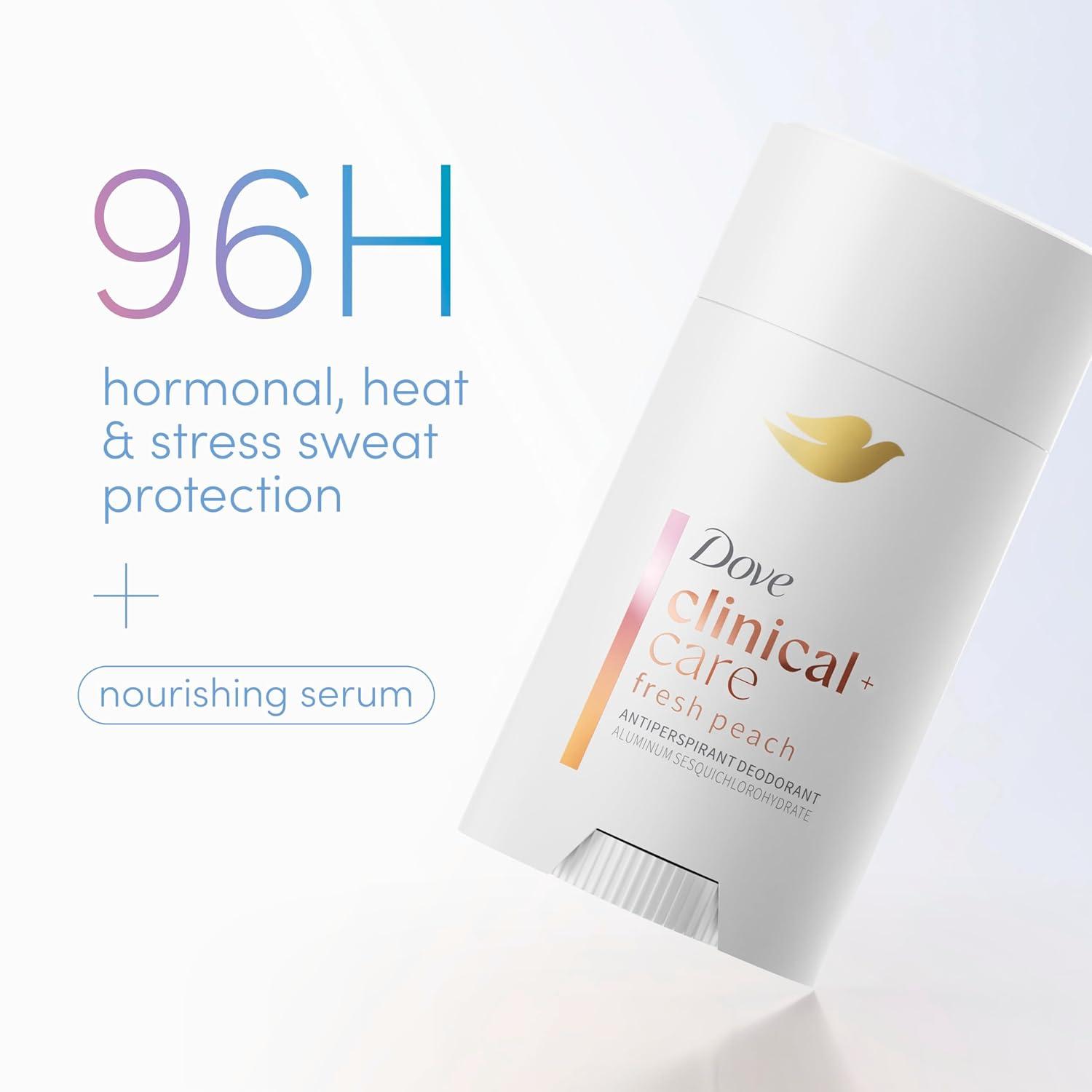 Meet Dove Clinical + Care Antiperspirant Deodorant, our best protection for hormonal, heat, and stress sweat. Designed for all of life's sweat triggers, this clinical strength antiperspirant deodorant invisible solid stick delivers 3x the protection of an ordinary antiperspirant, while being kind on skin. With its odor-fighting technology, you can feel fresh and confident throughout your day, no matter what challenges come your way. Ideal for long workdays, intense workouts, or travel, Dove Clinical + Care ensures you stay fresh and dry when it matters most. Enriched with 7% nourishing serum, Dove Clinical + Care has an advanced formula that not only helps repair the skin's natural barrier but also leaves your underarms feeling soft, smooth, and irritation-free – even after shaving. Dove is the dermatologist recommended antiperspirant deodorant brand and combines powerful protection with gentle care, making it an ideal deodorant for sensitive skin. This clinical antiperspirant deodorant features a long-lasting fragrance with delightful notes of fresh peach, elevating your daily routine. Dove Clinical + Care is easy to apply: simply glide onto underarms and enjoy instant dryness with lasting comfort. As part of Dove's commitment to care, this Dove Clinical + Care is PETA Approved Vegan. Globally, Dove does not test on animals.