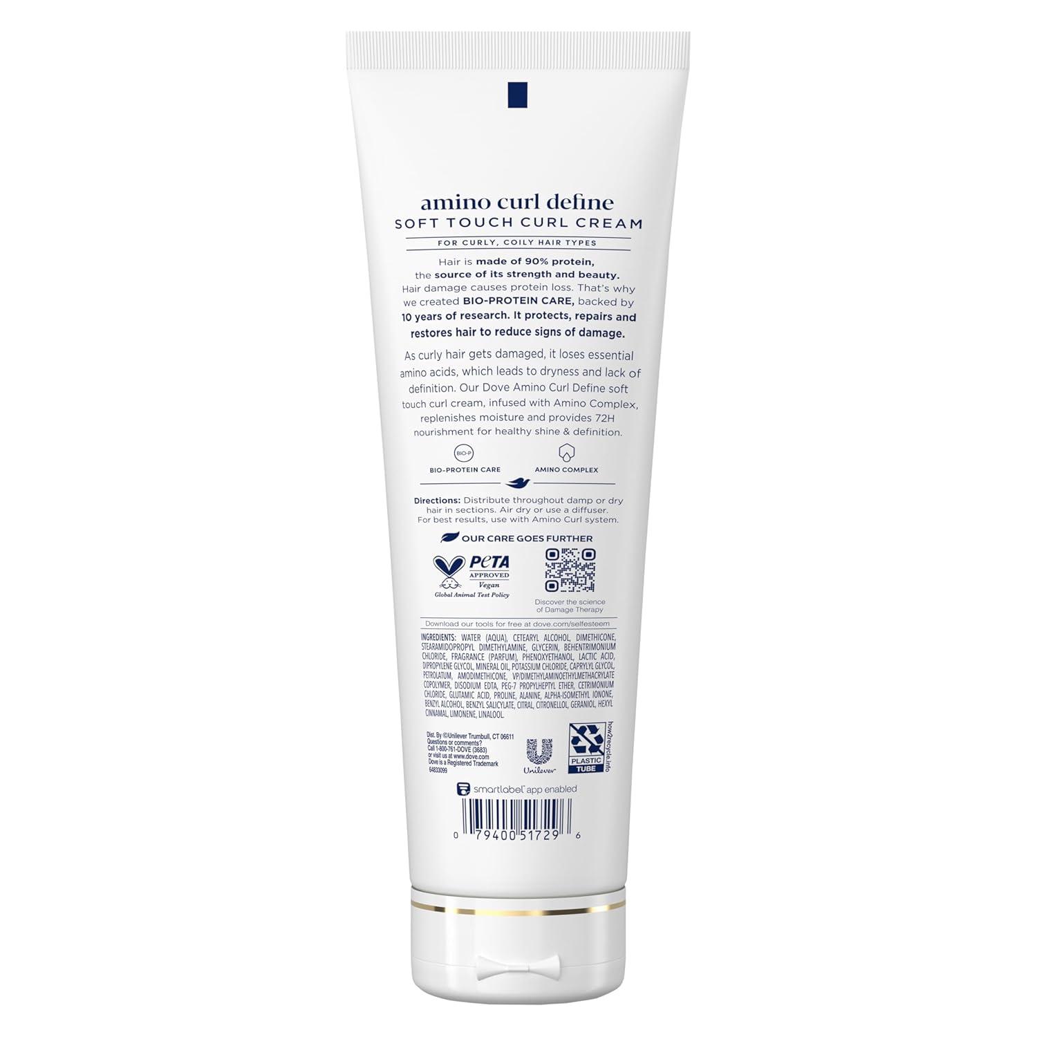 HOW TO USE: Distribute Dove Amino Curl Cream throughout damp or dry hair in sections. Air-dry or use a diffuser. For more definition, layer with preferred gel.