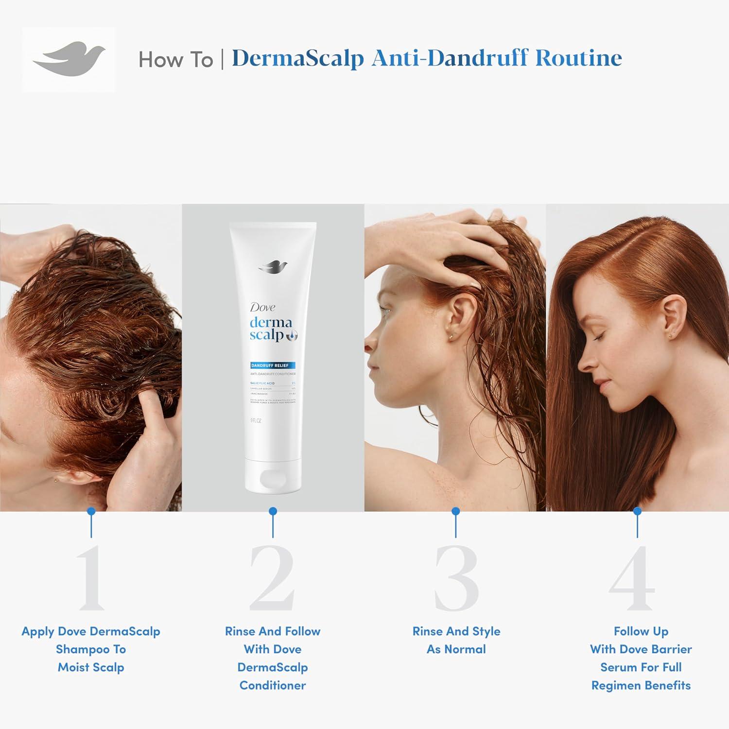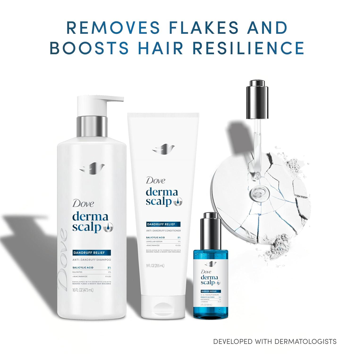 You are about to discover the benefits of Dove Derma Scalp Conditioner Dandruff Relief. After this, you will add this product to your hair care routine. Enhance your hair's natural resilience and elasticity with this conditioner, designed to fortify both your scalp and hair fibers against breakage and damage. Its sulfate-free formula deeply hydrates and moisturizes, reducing dryness and tightness for healthier, more vibrant hair. Dove Derma Scalp Conditioner Dandruff Relief is developed in collaboration with dermatologists, this conditioner is infused with science-backed ingredients, giving you the confidence to trust its effectiveness. Salicylic Acid gently exfoliates to remove scalp flakes, leaving your scalp clean and your hair smooth. These are just some of the Dove key benefits you are going to find inside this 9 oz conditioner bottle. Clinically proven ingredients like Niacinamide and Glycerin regenerate the scalp's protective moisture barrier, ensuring your hair looks and feels healthy from root to tip. Enjoy the comprehensive benefits of the Dove line, including shampoo, conditioner, and dry scalp treatment, all of which are certified vegan and PETA-Approved, making your hair care routine both effective and cruelty-free. Are you ready to add Dove Derma Scalp Conditioner Dandruff Relief to your hair care routine?