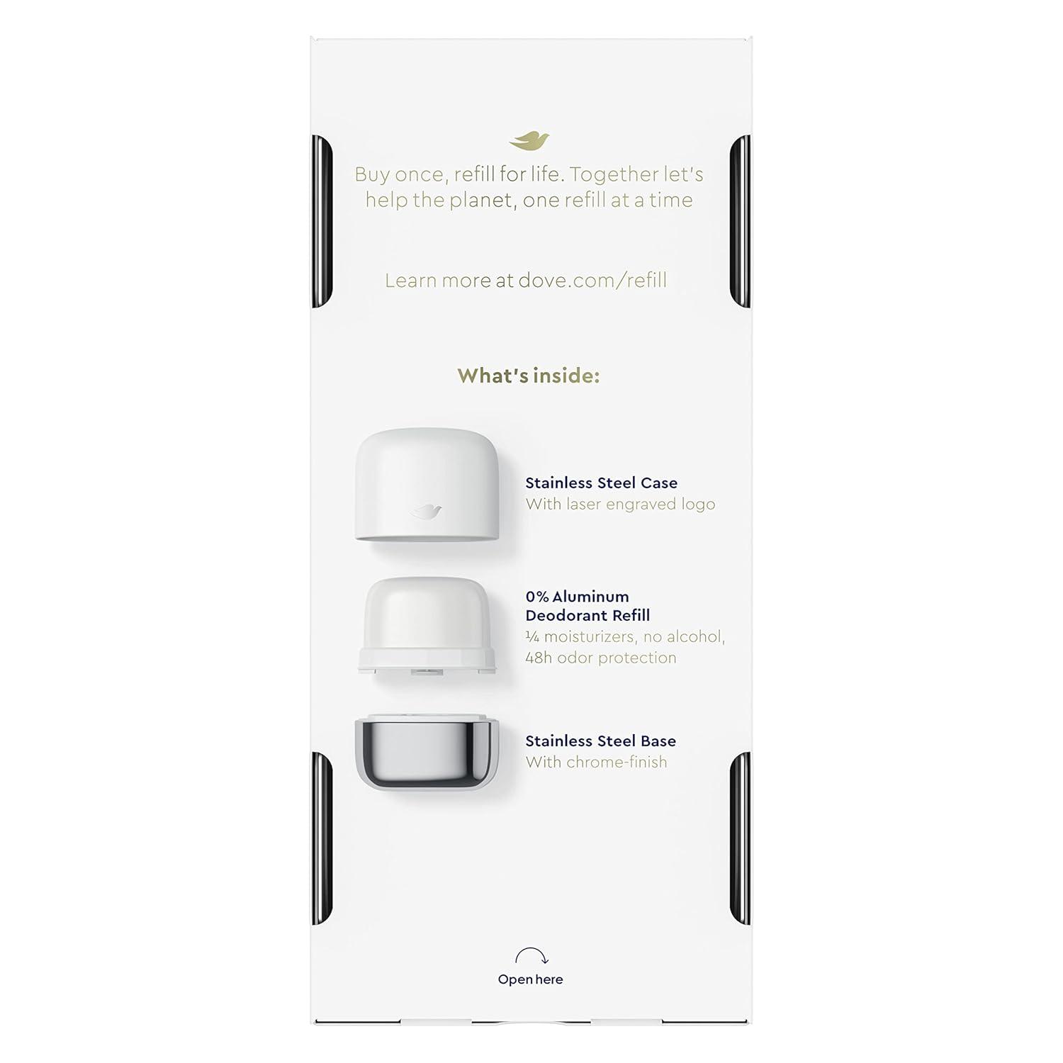 REFILLABLE DEODORANT STARTER KIT: Dove proudly introduces their first refillable deodorant, the starter kit contains a reusable, stainless steel case and one deodorant refill