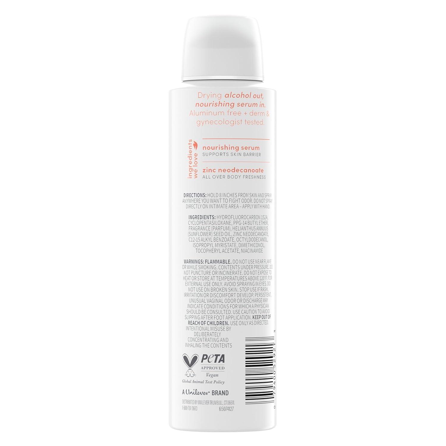 Alcohol stings. Dove nourishes. Dove Peach Glow Alcohol-Free Whole Body Deodorant Spray delivers odor control and skin care everywhere, without stinging or burning skin. Designed to care for your underarms, chest, back, thighs, and beyond, this innovative spray combines 72-hour odor control with the nourishing power of skin care. Enriched with 35% nourishing serum, it smooths your skin while keeping you fresh for up to 72 hours. The sweet, tropical aroma of Peach Glow lingers with a fresh finish and a subtle touch of sweetness. This alcohol-free deodorant formula is dermatologist- and gynecologist-tested. It is gentle anywhere you apply it, from pits, intimates*, thighs, toes, and even on just-shaved skin. We believe that when your skin feels good, you feel good – Dove Whole Body Deodorant is here to give you that extra boost. *Do not apply directly to intimate area – apply with hand